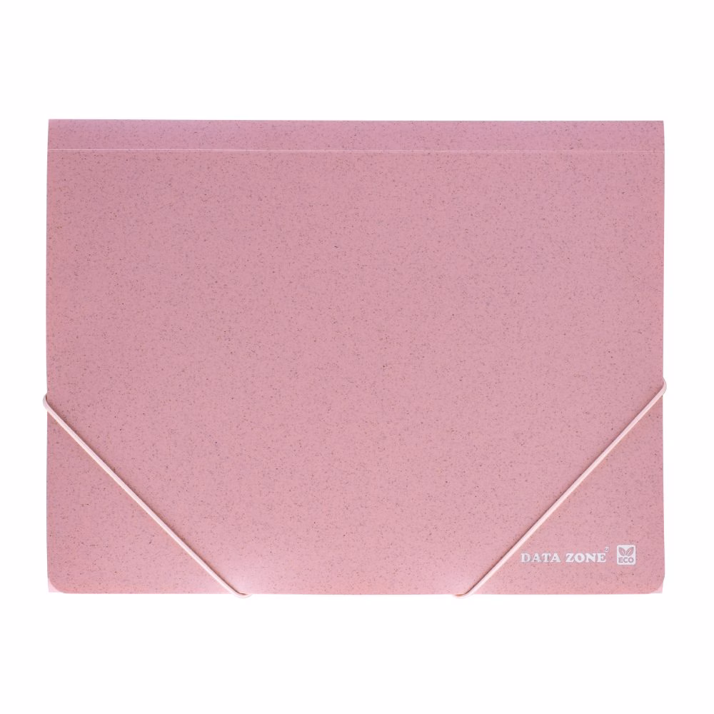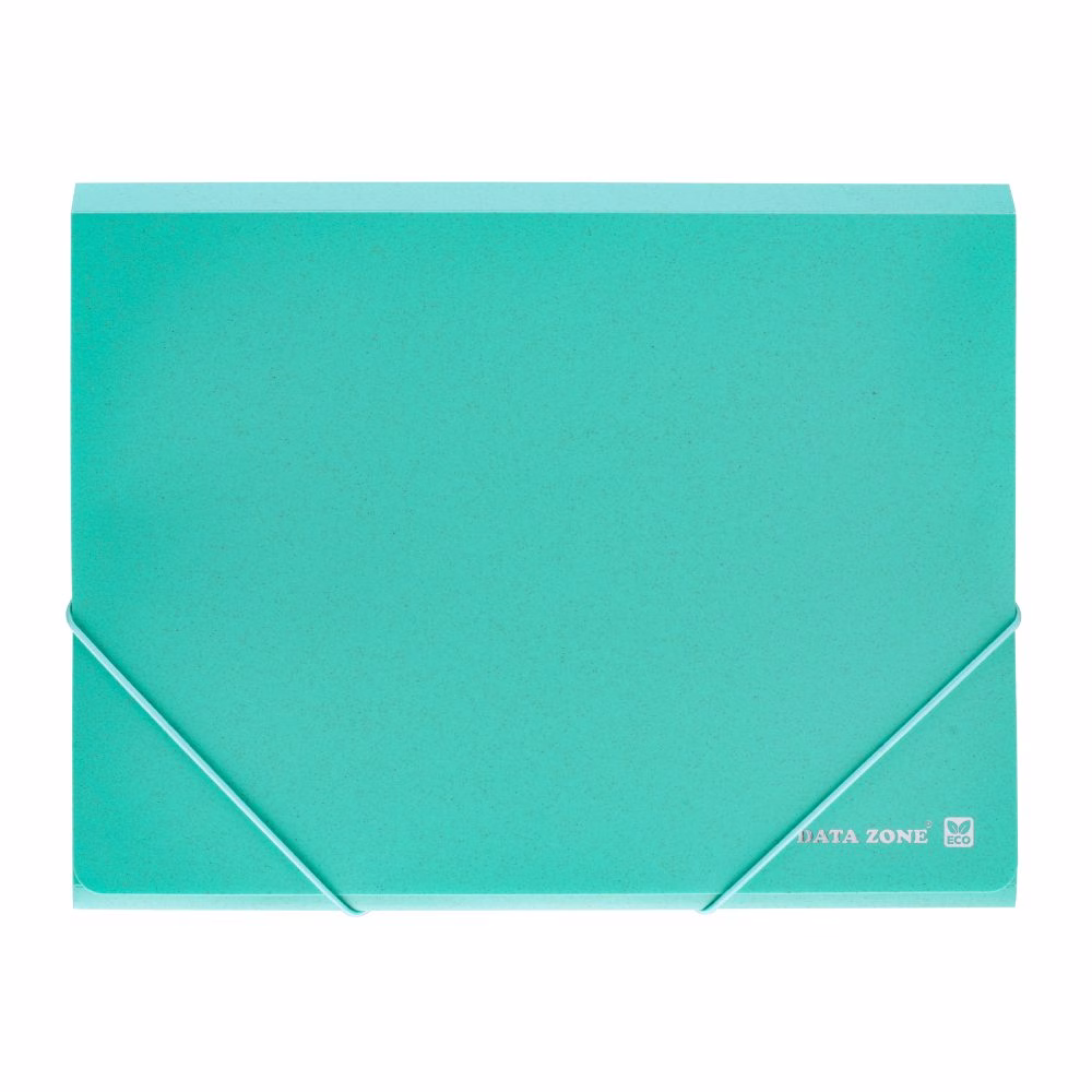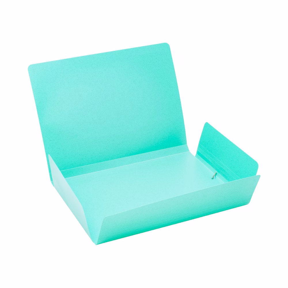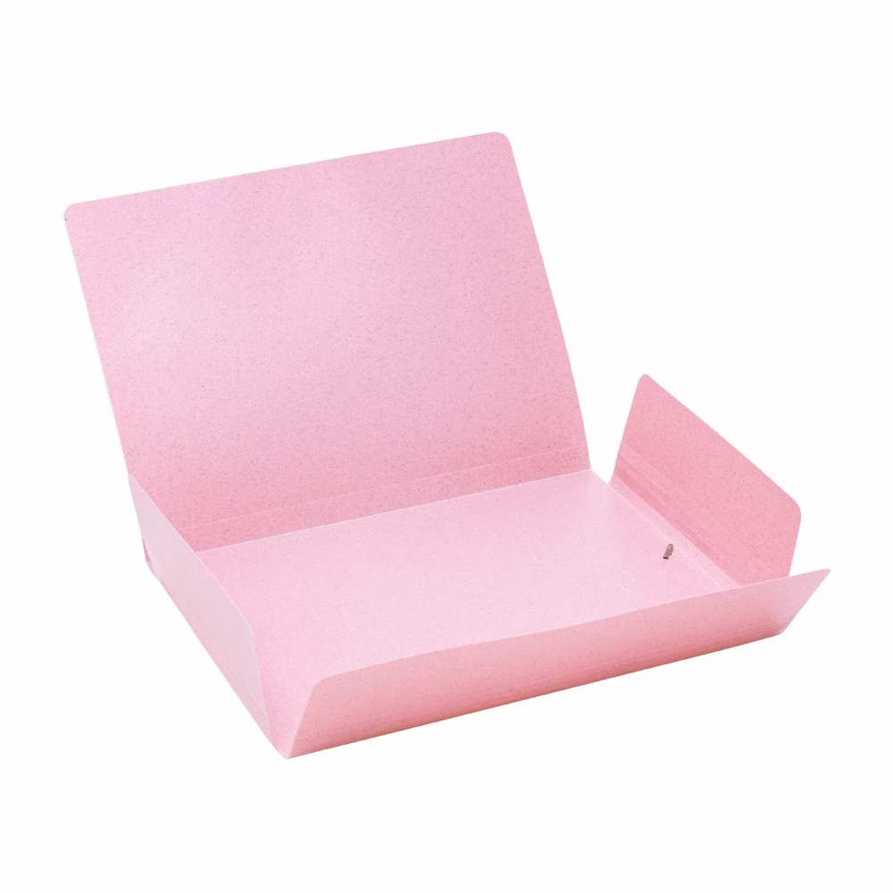 Carpeta tipo cartera está fabricada con tapas de fibra de trigo biodegradable y cuenta con pliegues en sus cuatro lados que se ajustan al contenido.