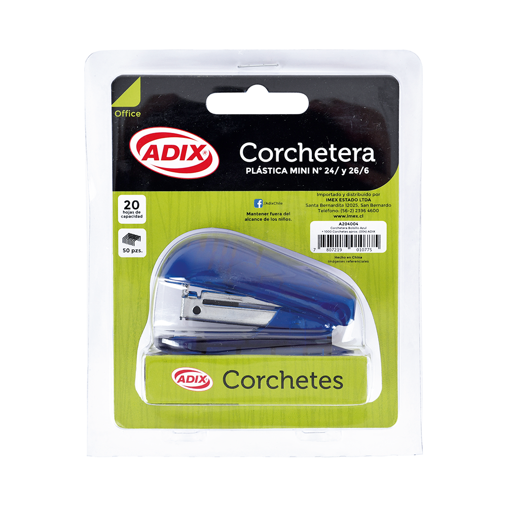Corchetera de bolsillo de colores + 1000 corchetes.