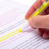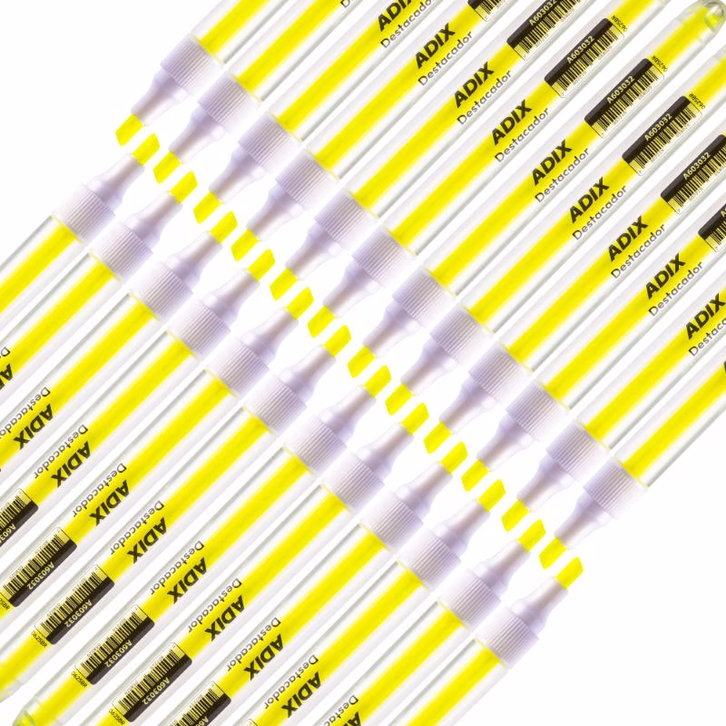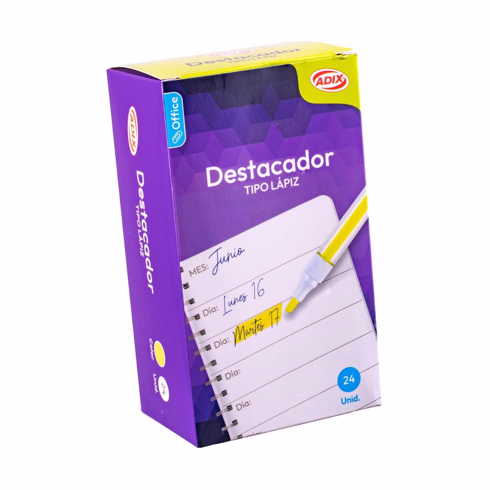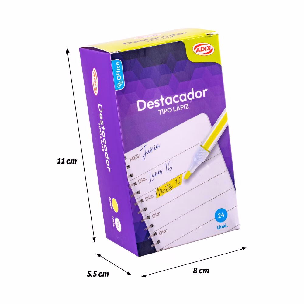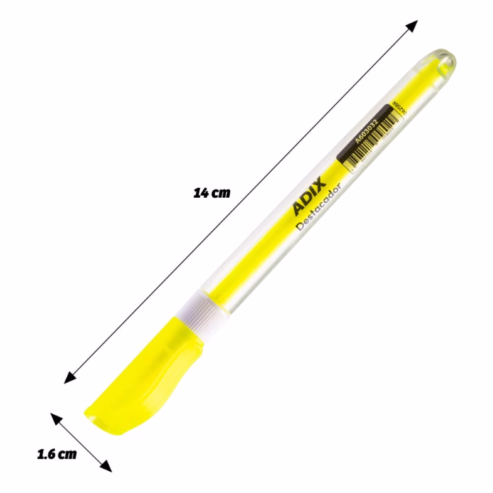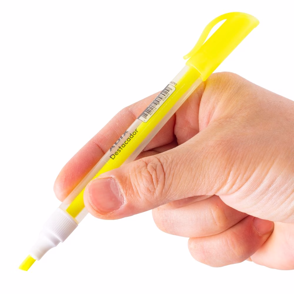 Este destacador tipo lápiz amarillo tiene tinta suave y punta biselada, ideal para subrayar textos con máxima precisión sin sacrificar comodidad. Su formato delgado (14 x 1.1 cm aprox.) los hace perfecto para llevar en estuches, bolsos o incluso el bolsillo.