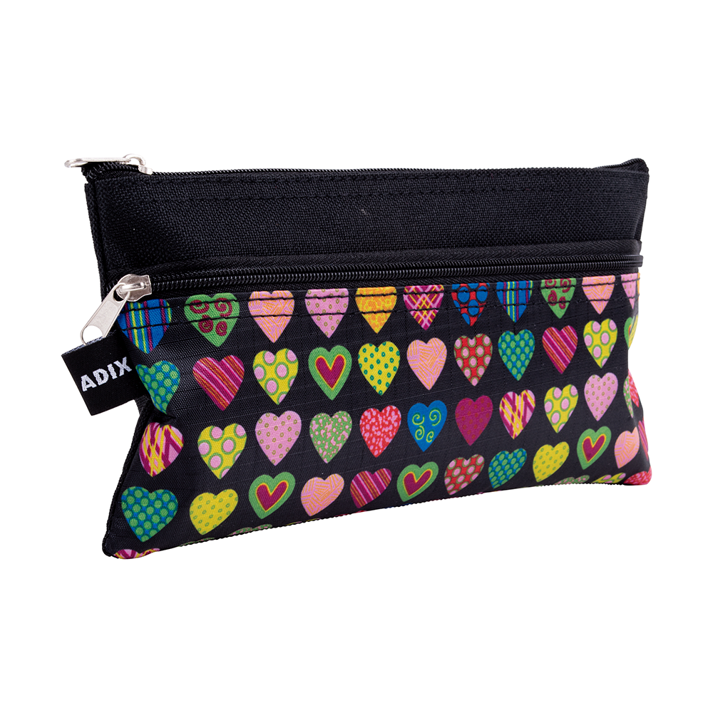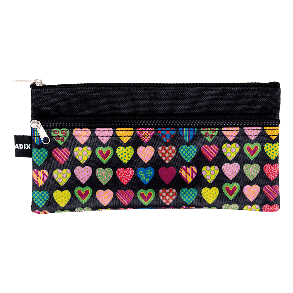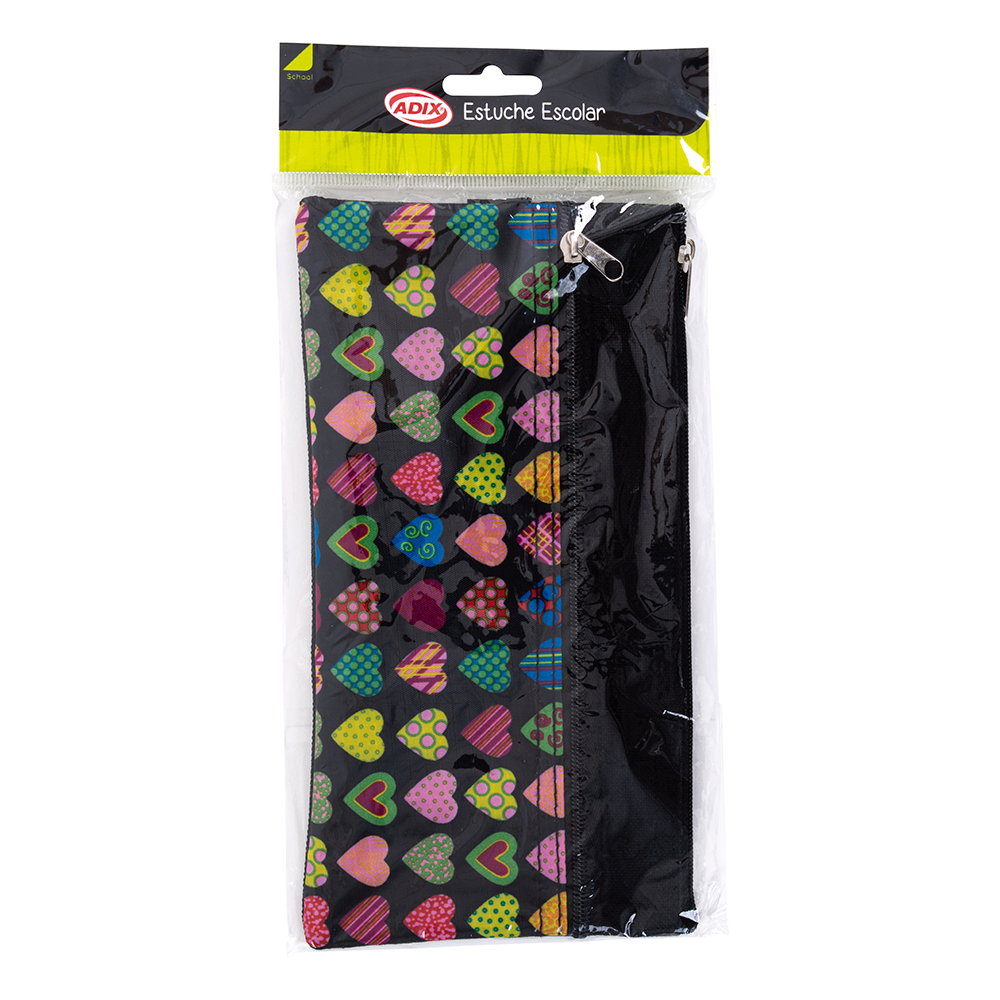 Estuche escolar con diseño corazón. Medidas: 22 x 11,3 cm. aprox. Dos cierres. Marca: ADIX