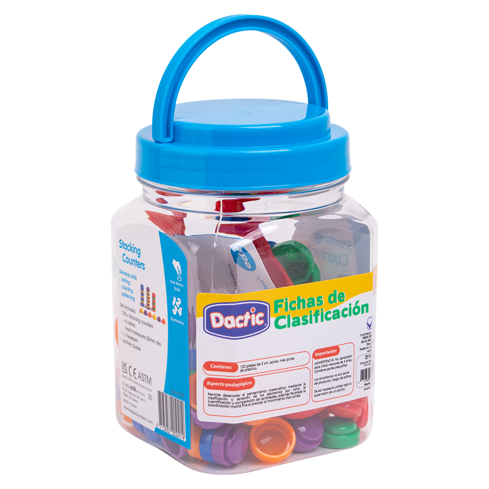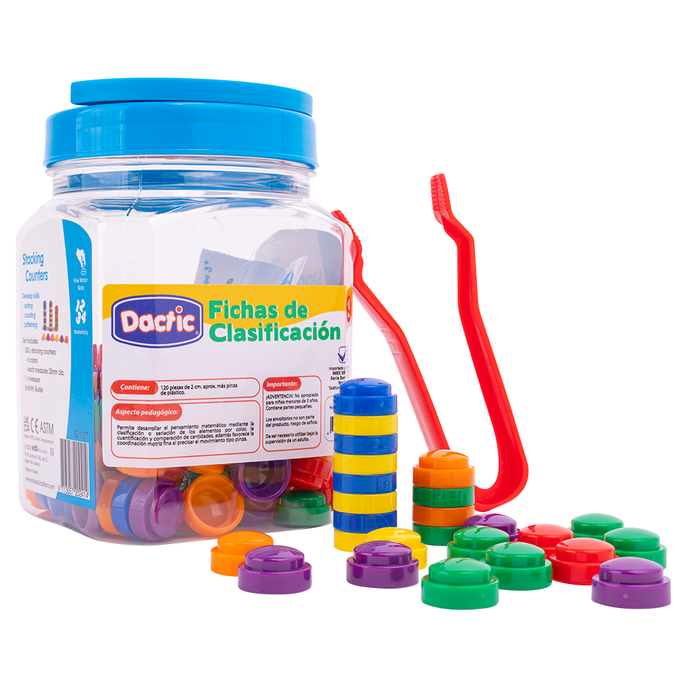 Contenido: 120 fichas de plástico de 2 cm. de diámetro más pinza.