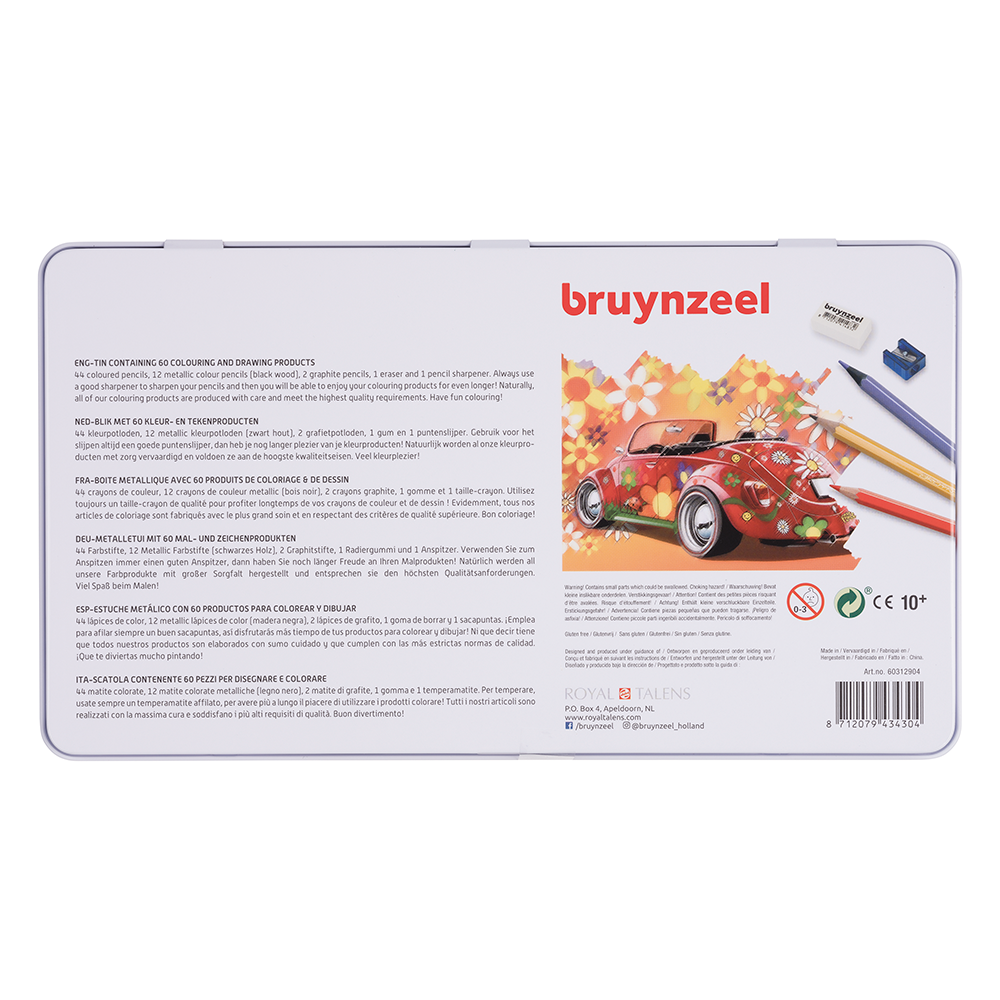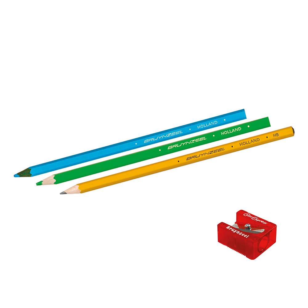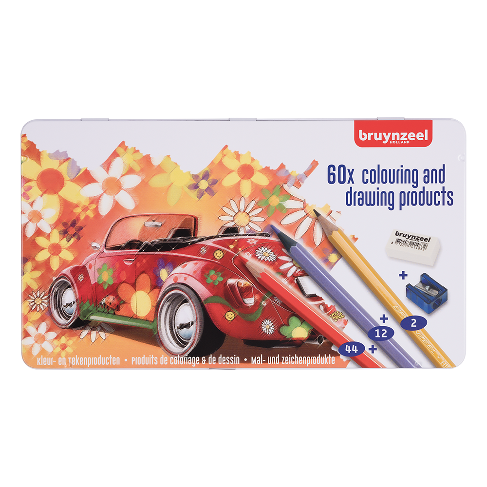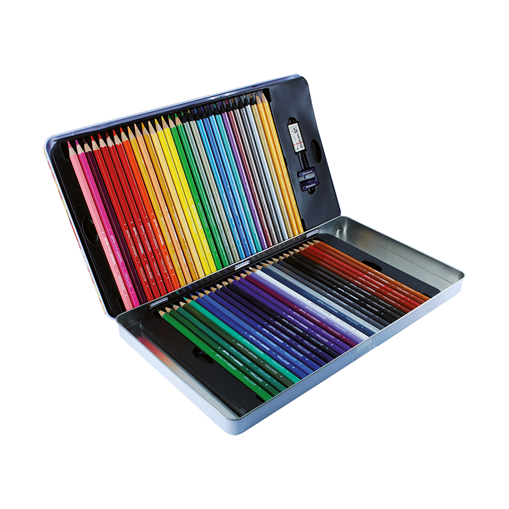 Incluye 56 colores, 2 grafitos, sacapuntas y goma de borrar.