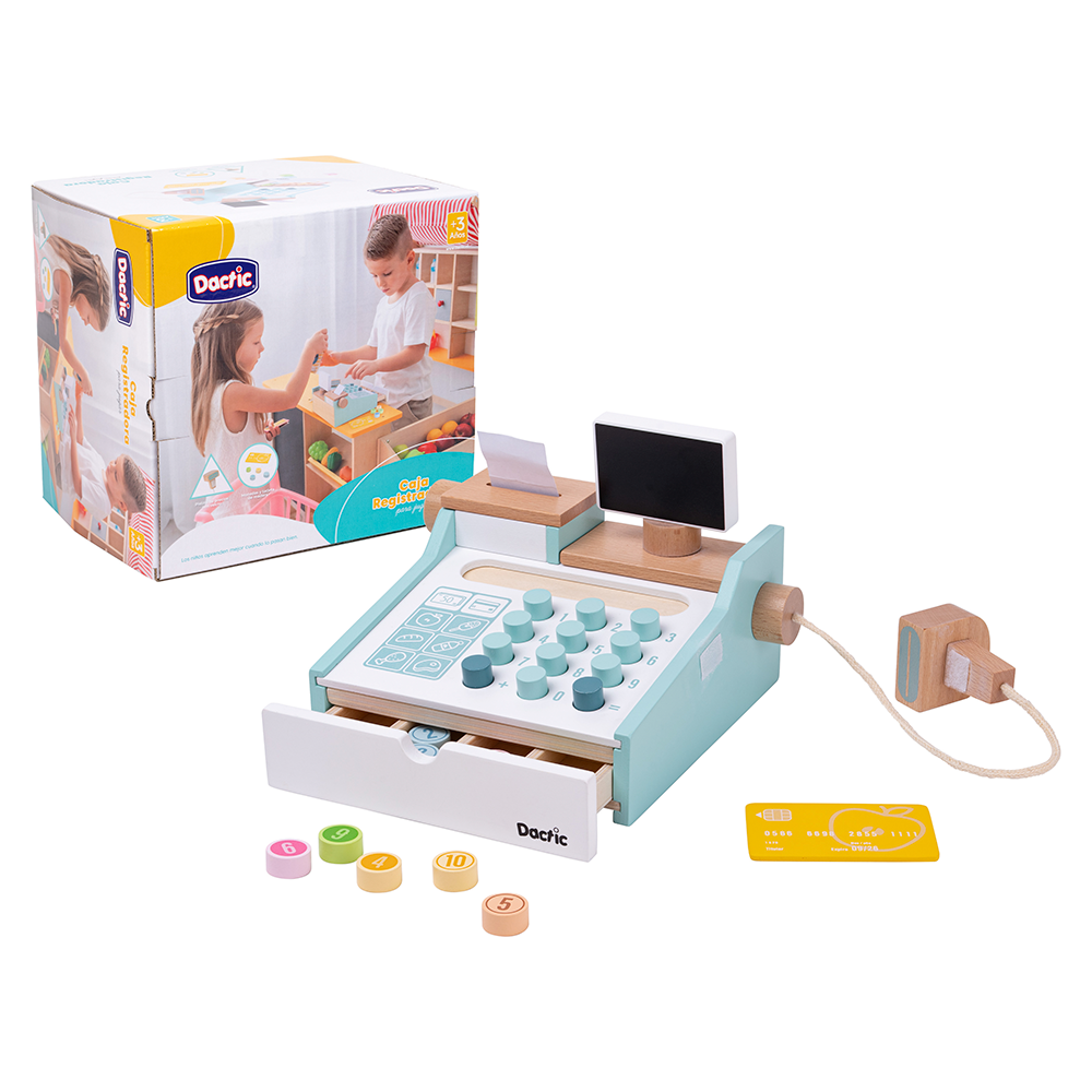 Contenido: Una caja registradora de 18 x 20 x 14 cm. aprox. más accesorios de madera.