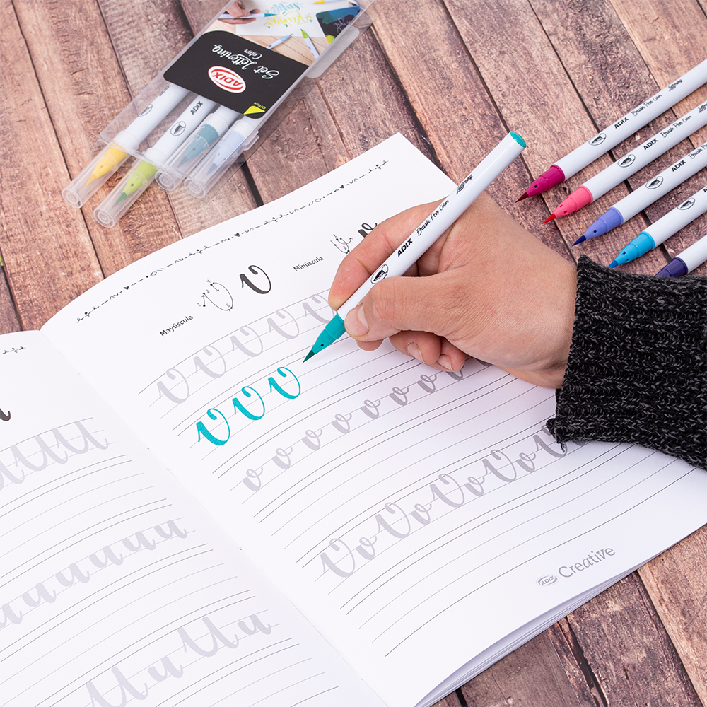 Contiene: 1 libro de caligrafía y lettering nivel1 + 10 brush pen de colores.