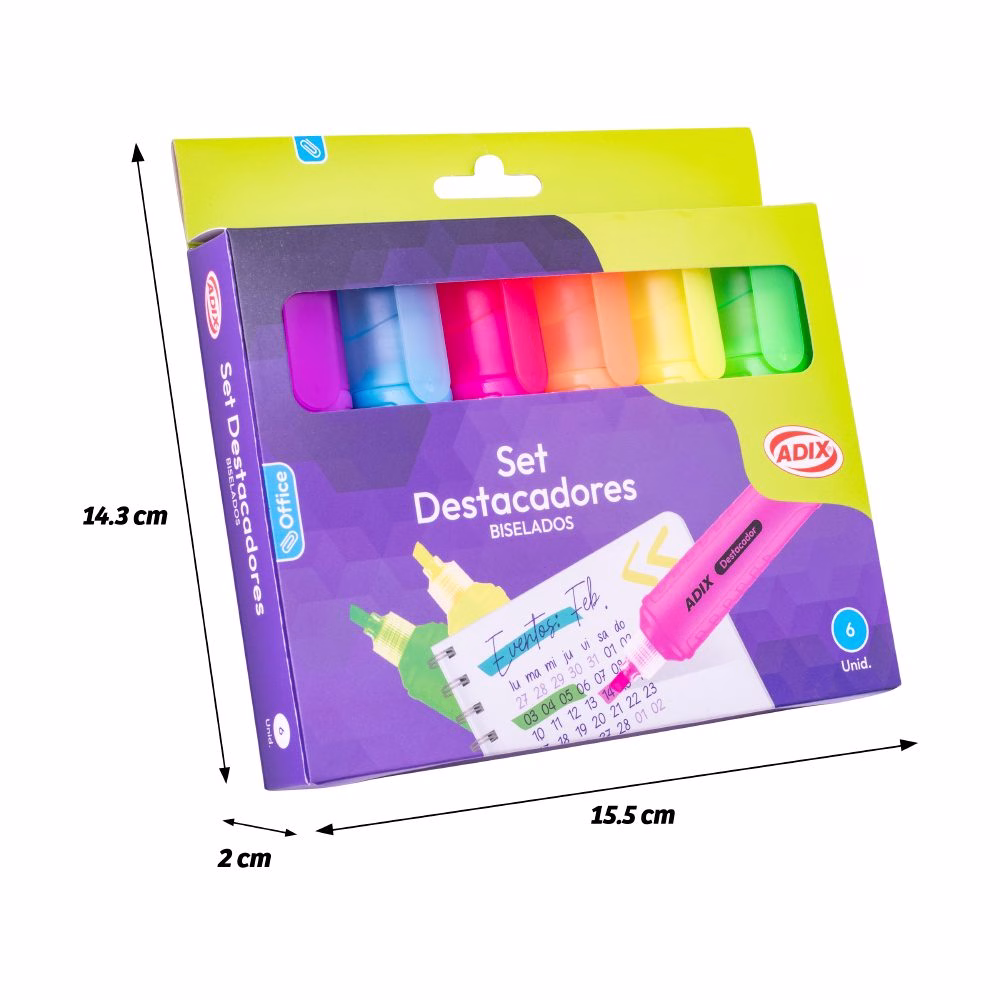 Este set de 6 destacadores Adix incluye colores vibrantes: amarillo, verde, anaranjado, rosado, azul y morado, ideales para organizar información de forma visual y creativa.