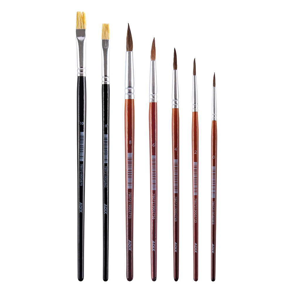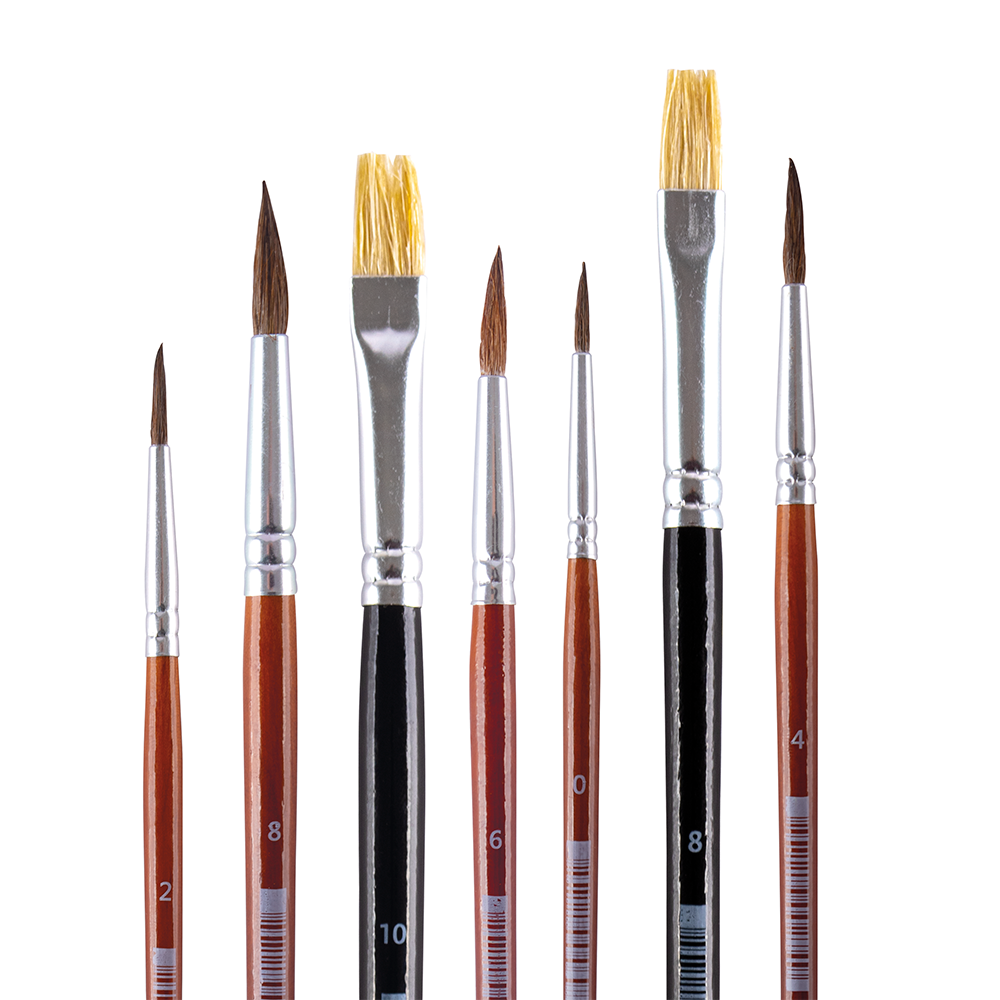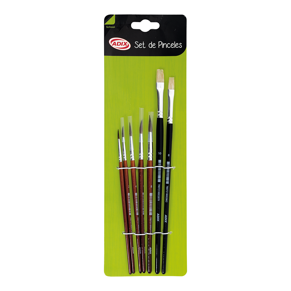 Incluye 5 unidades en pincel pelo de pony N° 0, 2, 4, 6 y 8 + 2 unidades de pincel pelo de chancho N° 8 y 10.