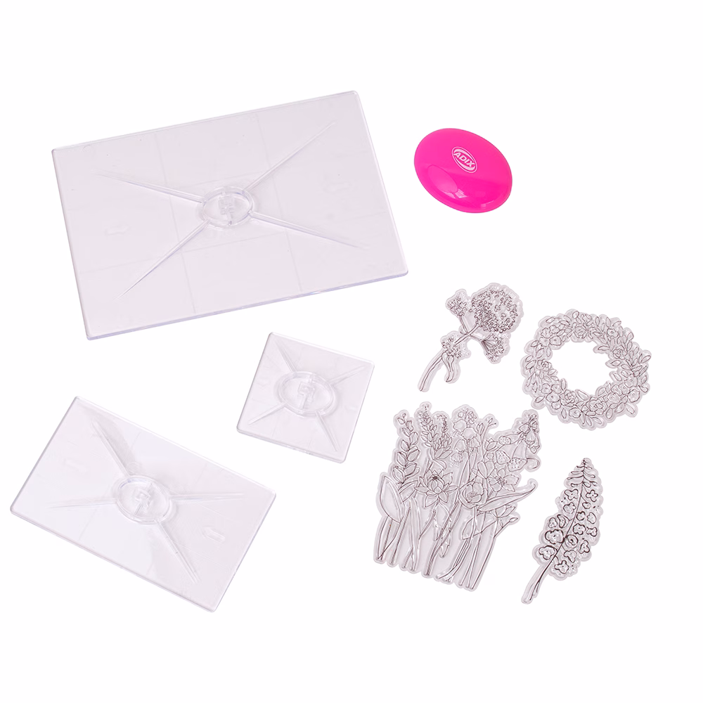 Set incluye 3 bases de diferentes tamaños, 1 mango y 4 plantillas de silicona con diferentes diseños.