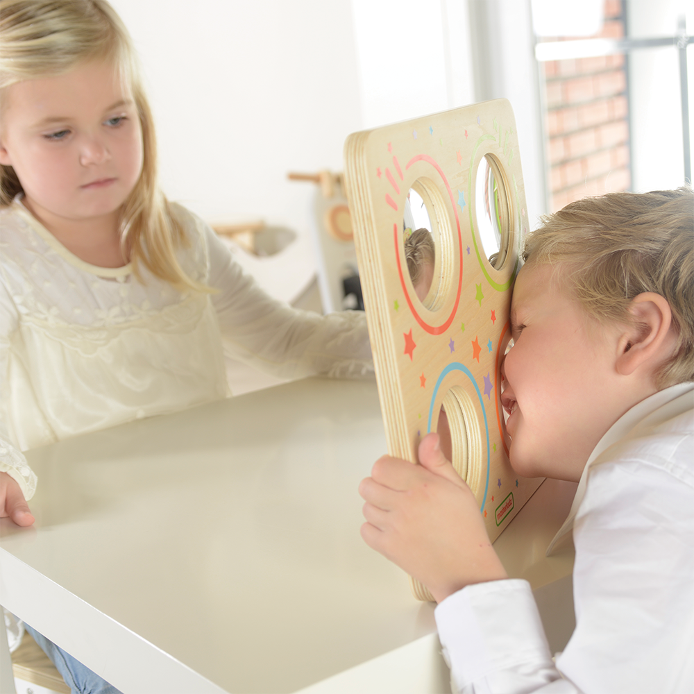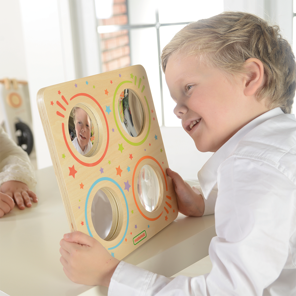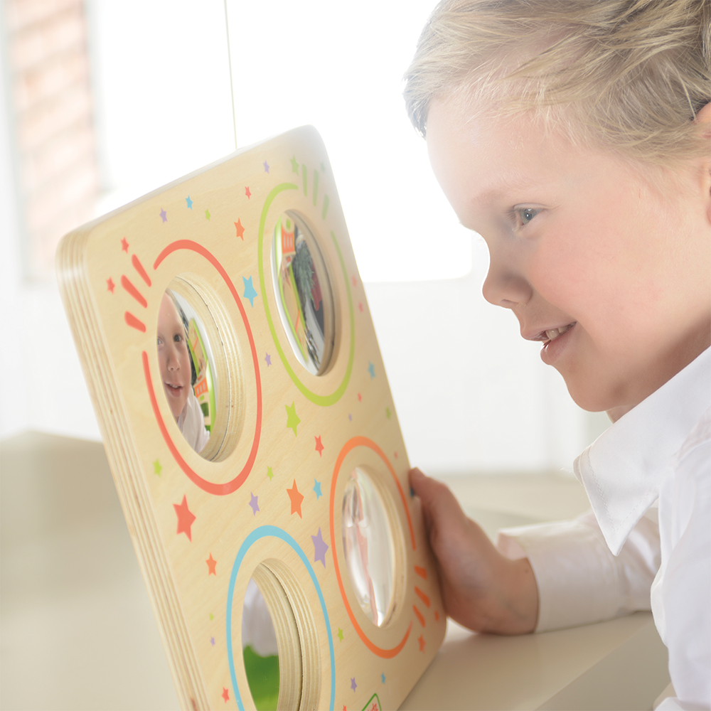 Experimenta diversos aspectos visuales al observar un lente cóncavo, convexo, una lupa y un espejo.
