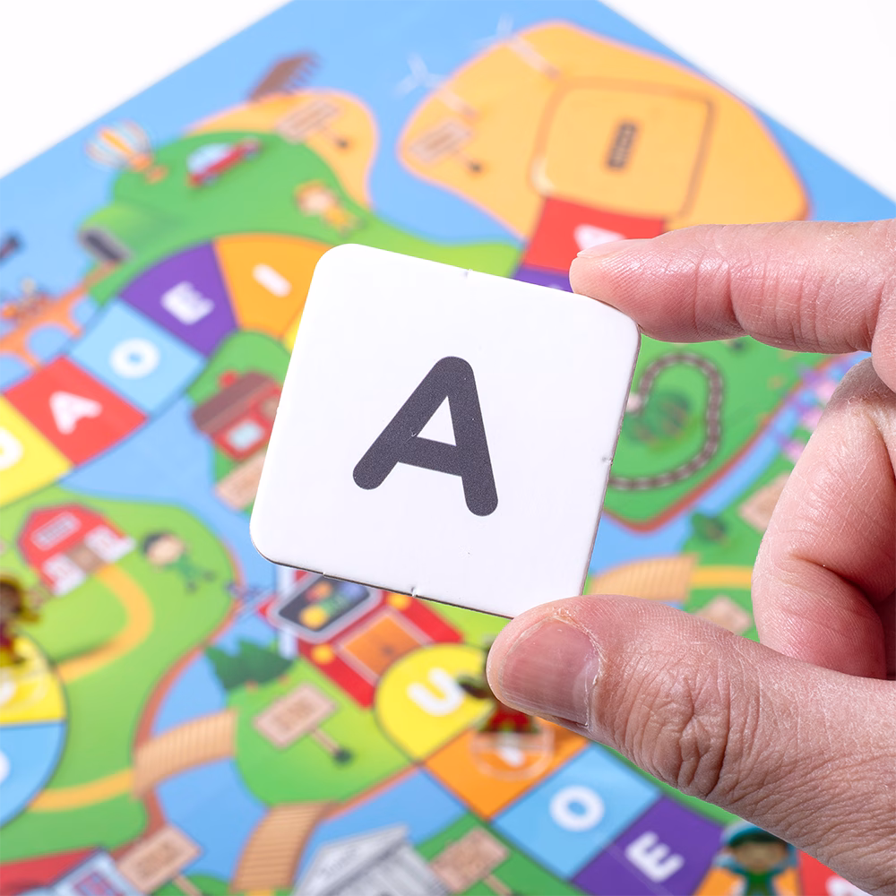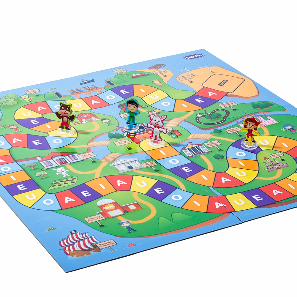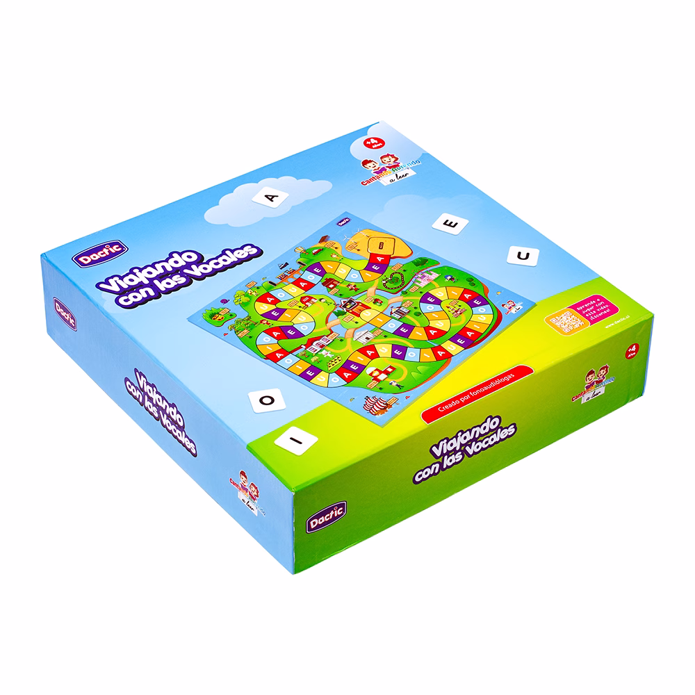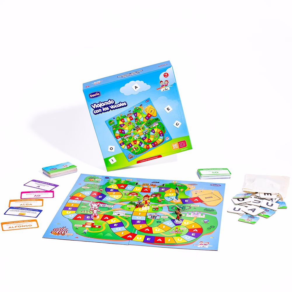 Contenido: 1 tablero de 42 x 42 cm, 70 láminas, 40 fichas de vocales, 4 fichas de personajes, 1 bolsa de tela, instructivo.